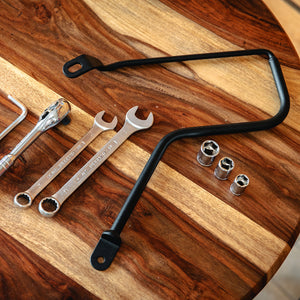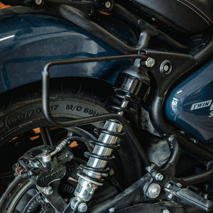Supports de sacoches en acier noir ultra résistants, spécialement conçus pour votre Royal Enfield Shotgun. Chaque écarteur est fabriqué dans notre atelier pour un look épuré, même si vous roulez sans vos sacoches. Nous avons dessiné ces supports pour qu’ils restent au plus près du cadre de la moto, assurant une intégration harmonieuse et évitant tout volume superflu.